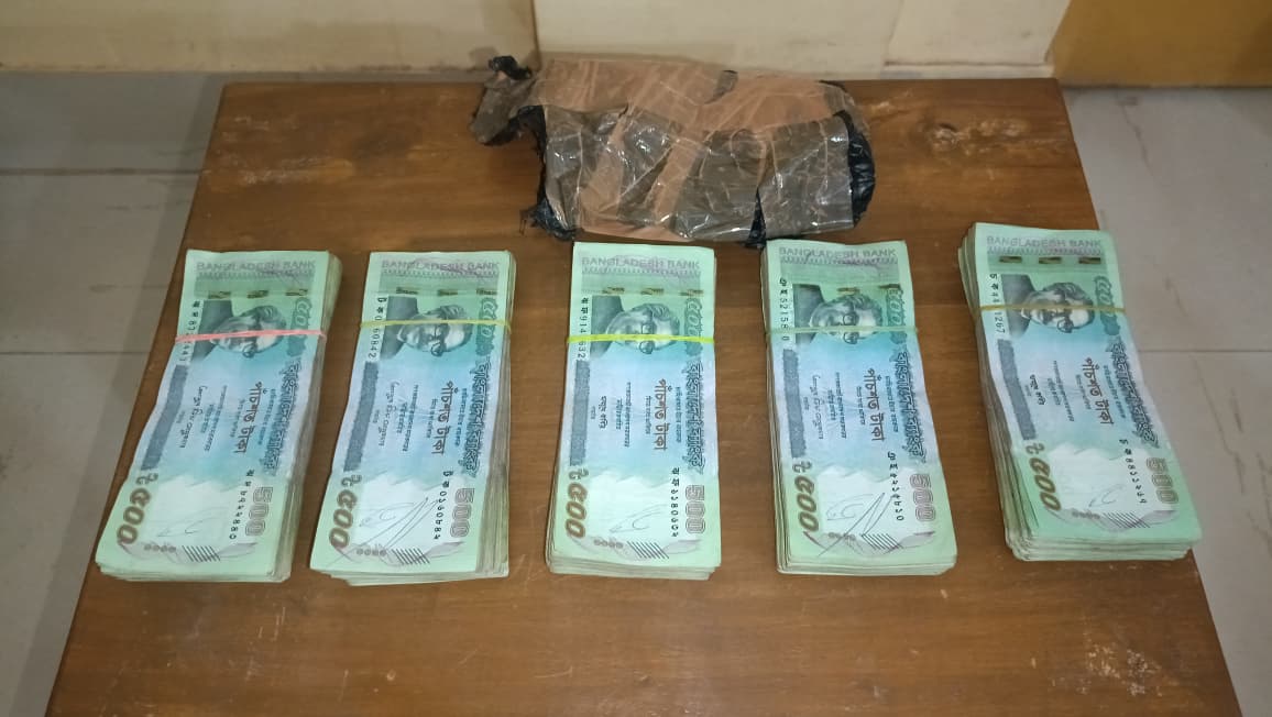 During a routine patrolling operation along the Kulubari–Kajitilla border road, security personnel recovered a substantial amount of Bangladeshi currency suspected to be linked to illegal cross-border movement. The recovered amount, totaling approximately 2.5 lakh in Bangladeshi currency, was found abandoned at the location and remained unclaimed at the time of seizure.
