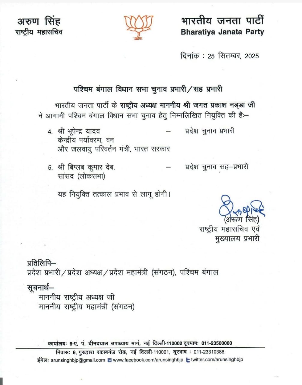 New Delhi, Sept 25: The Bharatiya Janata Party (BJP) has appointed former Tripura Chief Minister and Rajya Sabha MP Biplab Kumar Deb as the party’s election in-charge for West Bengal, ahead of the crucial state polls. This decision, announced by the BJP’s central leadership, underscores the party’s focus on strengthening its organizational base and electoral strategy in the politically significant state.