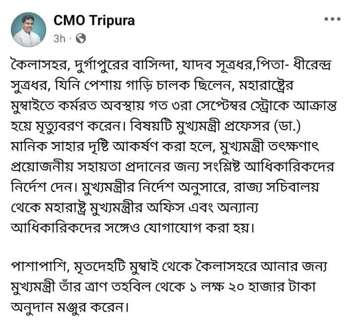 To facilitate the arrangements, Dr. Saha sanctioned an amount of Rs. 1.20 lakh from the Chief Minister’s Relief Fund. The financial assistance covered the expenses required for the transportation of Sutradhar’s mortal remains from Mumbai to Kailashahar.