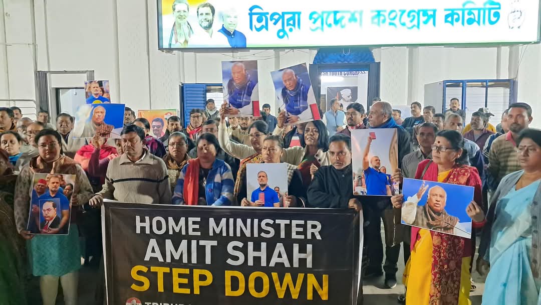 Agartala: Dec 20: The Sadar District Congress has strongly condemned Union Home Minister Amit Shah for remarks made about Dr. B.R. Ambedkar, the architect of the Indian Constitution, in Parliament. Today, Congress workers staged a protest in front of the state Congress office to express their disapproval of the Home Minister’s comments.