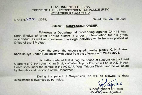The official order stated: “During the period of suspension, the headquarters of C/1444 Amir Khan Bhuiya of West Tripura District will be at AD Nagar Police Lines under the control of the AC DAR, West Tripura District, and he will abide by the rules and discipline of the department.”