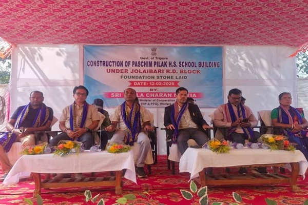 Agartala, February 12: A significant step toward strengthening educational infrastructure in Tripura was marked on Thursday as Sukla Charan Noatia, Minister and MLA of Jolaibari constituency, laid the foundation stone for a new two-storied building at West Pilak Higher Secondary School. The ceremony was attended by local leaders, members of the school management committee, teachers, parents and students.