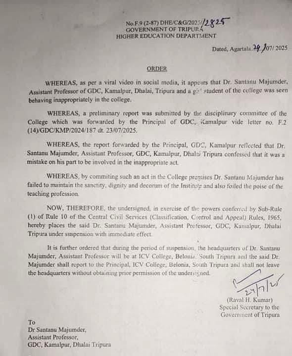 Agartala, July 25: In a significant disciplinary action, the Higher Education Department of Tripura has suspended two Assistant Professors from government colleges under Tripura University over serious allegations of misconduct and malpractice.