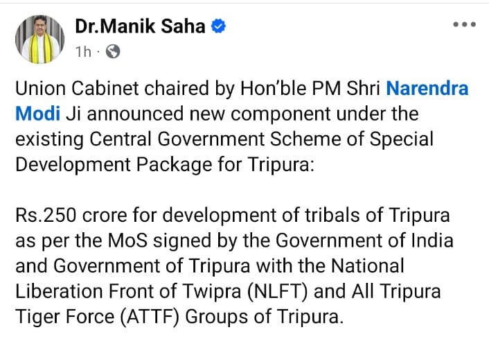 Agartala, Aug 9: In a significant development for Tripura, the Union Cabinet led by Prime Minister Narendra Modi on Friday approved a fund of ₹250 crore for the state. The allocation will be spread over four years from the financial year 2025–26 to 2028–29 and is aimed at fulfilling commitments made under the Memorandum of Settlements (MoS) signed with the National Liberation Front of Twipra (NLFT) and the All Tripura Tiger Force (ATTF).